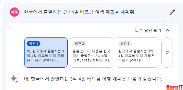 첫째, 구글 바드에게 1개의 질문을 하면 구글 바드는 총 3가지 답변을 제시해 줍니다. 구글 바드의 답변 제시 화면에서 우측 상단을 보면 다른 답안 보기를 선택할 수 있습니다. 바드가 처음으로 제시해 준 답변이 마음에 들지 않을 때는 2번째, 3번째 답변을 확인해 보면 좋습니다.